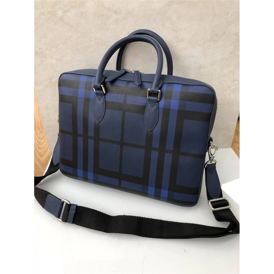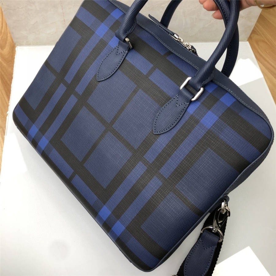 新款男包蓝色PVC格纹拼皮办公商务公文包